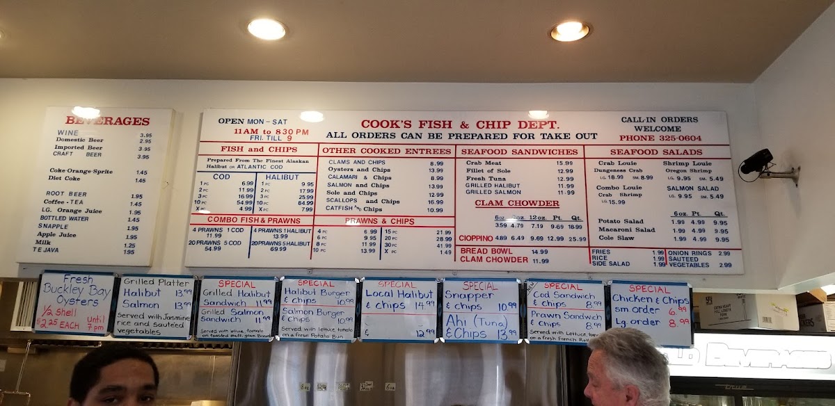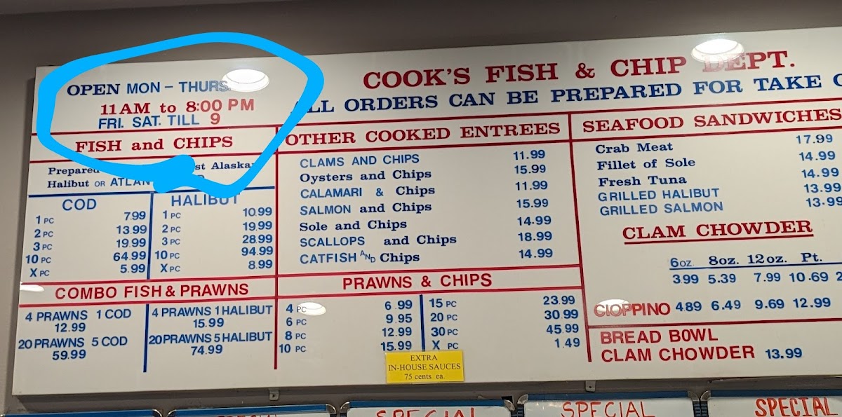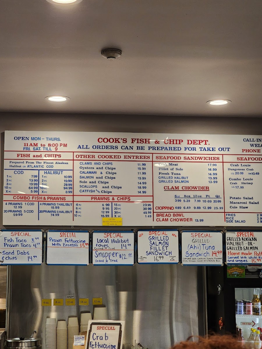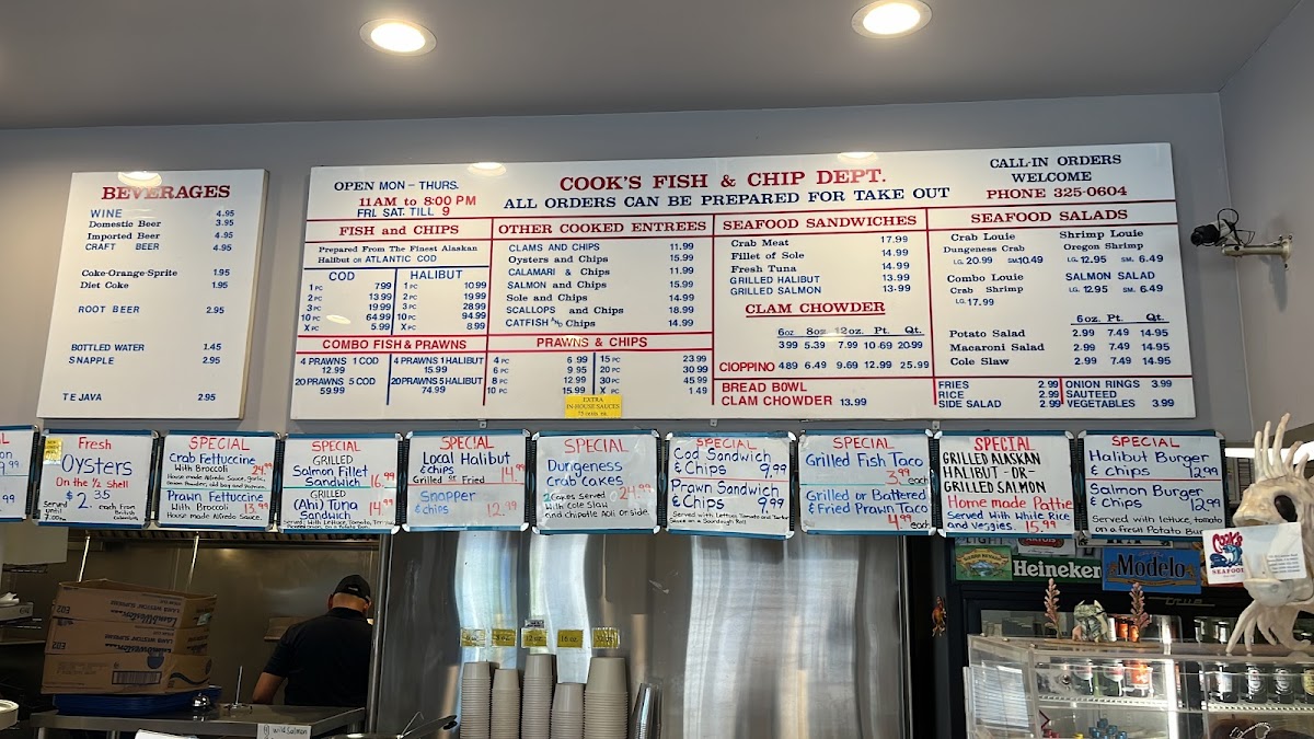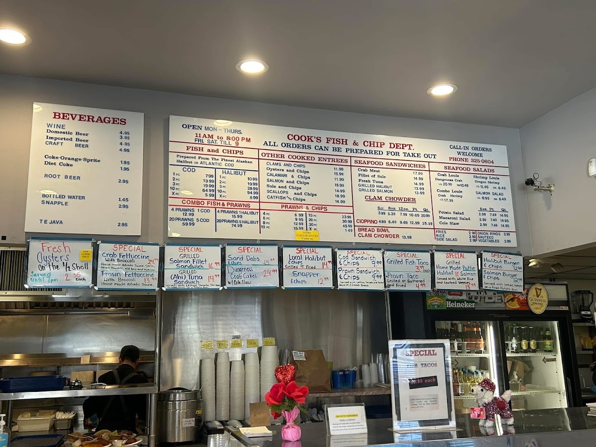 The menu at Cook's Seafood offers a straightforward and approachable selection, reflecting its casual, no-fuss atmosphere. It’s a place where simple seafood favorites meet fresh, satisfying flavors — perfect for a relaxed lunch or an easy dinner by yourself or with friends.